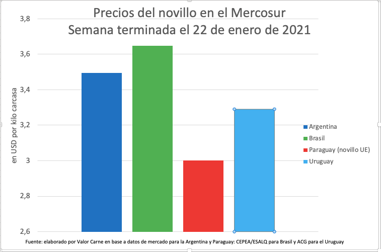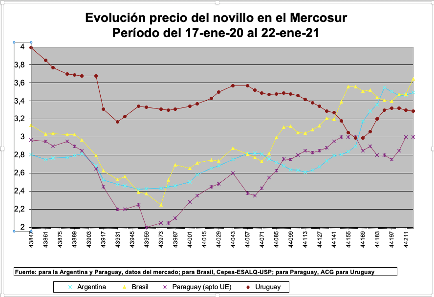 Paraguay: el novillo terminado certificado para UE cotiza a USD3, igual que en la semana pasada, cuando se elevó 15 centavos. Es la plaza de menor precio regional, en la que los negocios siguen un ritmo tranquilo.