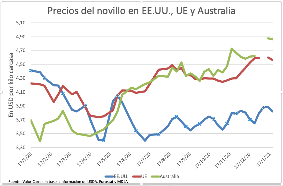 En cambio, en el fuerte aumento en Australia tuvo más influencia el nivel pagado domésticamente que la valorización de su dólar. Desde octubre que tiene el novillo más caro de entre los tres, lo que resulta una anomalía.