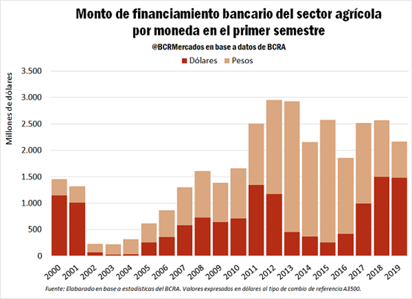 Debido al esquema de agregados monetarios que aplicó el BCRA para controlar la inflación, la tasa de interés endógena en pesos resultante de este compromiso aumentó muy por encima de las expectativas inflacionarias. El incremento resultante de la misma generó que muchos productores se inclinen a la toma de préstamos en dólares. En la ecuación financiera, con insumos dolarizados, ingresos correlacionados con el tipo de cambio y tasas de interés menores, se torna conveniente la toma de préstamos denominados en moneda extranjera, ganándole a la estrategia de financiación en pesos. El promedio de las tasas de interés pagadas por el financiamiento en dólares fue del 6 a 7 % anual en el segundo trimestre del año 2019 mientras que las tasas en pesos alcanzaron valores superiores el 70 % anual. Recordemos que dos años atrás, las tasas de interés en dólares de los préstamos bancarios a productores oscilaban entre el 4/4,5% anual.