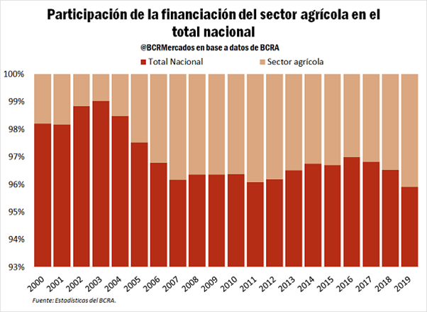 En línea con la baja del nivel de actividad, la participación del financiamiento del sector agrícola respecto al nivel nacional aumentó. Alcanzando el 4,7 % del total. A pesar de la gran cantidad de divisas y dinero que genera el sector agropecuario, es muy bajo el nivel de financiamiento que tiene con el sector bancario nacional. Este, a lo largo de los años, encontró otras alternativas para la financiación de los insumos y del capital del trabajo, como los pooles de siembra, la financiación de capitales en el exterior, la utilización de capital propio y el canje de cereales y oleaginosas como pago de insumos y maquinaria agrícola.