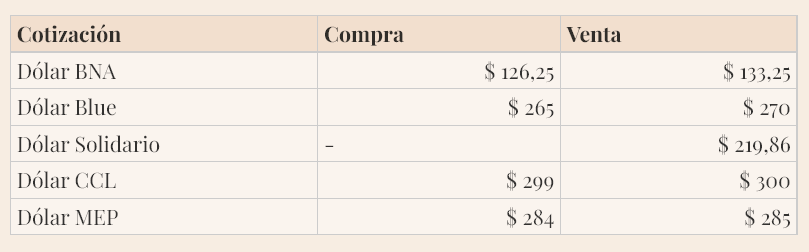 Las cotizaciones financieras del dólar como el MEP, a través del bono AL30, y el contado con liquidación (CCL), mediante el GD30, se venden a $ 285 y $ 300, respectivamente.