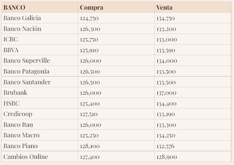 En cuanto al tipo de cambio oficial, el dólar minorista se vende en un valor de $ 132,25 para la venta en las pantallas de Banco Nación.