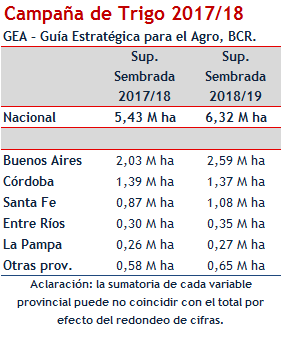 Si bien los guarismos de superficie del trigo 2018/2019 seguirán revisándose mensualmente, hasta llegar a la configuración final, en el presente informe se estima un área total de 6,32 millones de hectáreas. Este guarismo es un 16% superior a los 5,43 millones de hectáreas cultivadas en la campaña anterior.