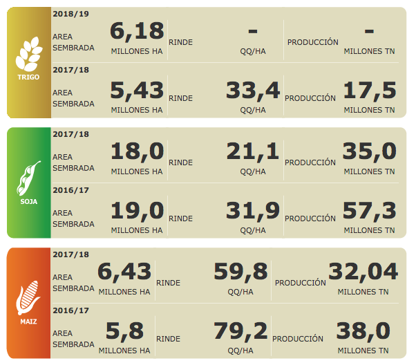 Tomando como supuesto 1,0 M de ha sin entrar en el circuito de comercialización granaria, la producción para grano tendría una base cosechable de 5,8 M de ha. Los pronósticos suponen que las lluvias estén favor del ciclo del cultivo, dejando con escasas posibilidades la repetición de un evento seco cómo se expresó el año pasado. No se avizoran los problemas de excesos hídricos del año pasado, ni zonas que sufran una falta de agua que no sea propia de la oferta típica invernal a un mes de comenzar la siembra. Los indicadores de los océanos son favorables para el restablecimiento de las lluvias para septiembre, y un “Niño” de baja intensidad se proyecta para los meses de verano. Por lo tanto podría esperarse un escenario de producción favorable en el que se alcanzase buenos niveles de rinde. Bajo estas conjeturas, la cosecha maíz 2018/19 estaría arrojando un volumen de 45 a 46 M de Tn.
