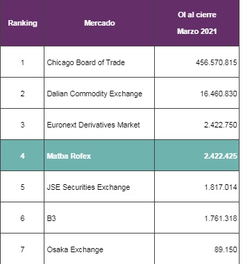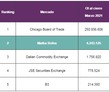 Respecto de la soja, la posición abierta supera los 4 millones de toneladas, convirtiéndose en la segunda más grande a nivel mundial, por detrás de la plaza de Chicago, duplicando a la del mercado chino de Dalian. En Maíz, Matba Rofex comparte el tercer puesto global, acercándose a los volúmenes de Euronext, y por detrás del Chicago Mercantil Exchange y Dalian.