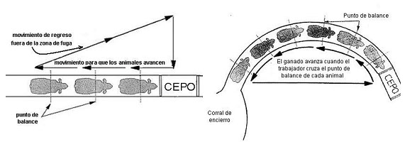Los animales poseen una zona de fuga (perímetro variable que lo rodea), una zona de lucha (perímetro variable muy cercano al animal) y un punto de balance ubicado a la altura de los hombros del animal (Figura 1). Cuando una persona atraviesa los límites de la zona de fuga, dependiendo de su situación respecto al punto de balance, el animal tenderá a fugarse (escapar) en dirección contraria. Es decir, si el operario se acerca entre los 45 y 60° por detrás del punto de balance el animal caminará hacia delante y viceversa. Por el contrario, si nos acercamos más y penetramos en su zona de lucha el animal se defenderá atacándonos.