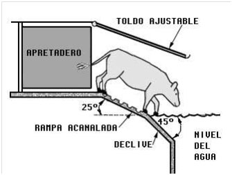 Las instalaciones del bañadero son de gran importancia ya que pueden facilitar o complicar dicha tarea. Para generar el ingreso fluido y evitar complicaciones, se recomienda que la rampa de entrada no sea de superficie lisa y corta, sino más bien una rampa antideslizante inclinada de 2 m que se encuentra en un ángulo de 20 a 25°. La rampa debe ser antideslizante para permitir buen apoyo evitar que el animal se asuste y se rehúse a entrar. La porción de la rampa que se hunde abruptamente en el agua está escondida, y parece como si la rampa continuara. Tiene como finalidad orientar el centro de gravedad del animal hacia el agua y por lo tanto el producir la sumersión de la cabeza, evitando la necesidad de uso de la horquilla. La utilización de un techo bajo inclinado hacia el agua obliga al animal a entrar al baño con la cabeza hacia adelante y evita que este salte al centro del bañadero (Figura 3).