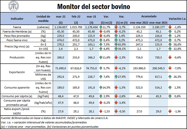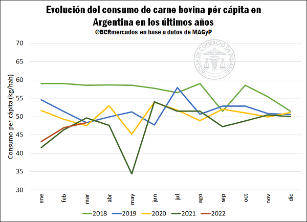 El consumo per cápita medido en kilos por habitante, comenzó el año con un desempeño un 3,9% superior al primer registro del 2021. Sin embargo, la brecha se achicó a un 1% en febrero y en marzo el consumo por habitante se encontró un 2,6% por debajo del mismo mes de año pasado. En otras palabras, si bien el primer bimestre dio señales positivas en cuanto al consumo de carne bovina de los argentinos, aún hay incertidumbre sobre los resultados que se tendrán a lo largo de este año.
