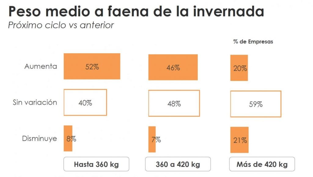 Así respondió el 52% de los productores que hacen invernadas livianas (hasta 360 kg) y el 46% de aquellos que hoy terminan su hacienda entre 360 y 420 kg. En tanto, el 59% de los que hacen más de 420 kg apuntan a mantenerse en los pesos actuales.