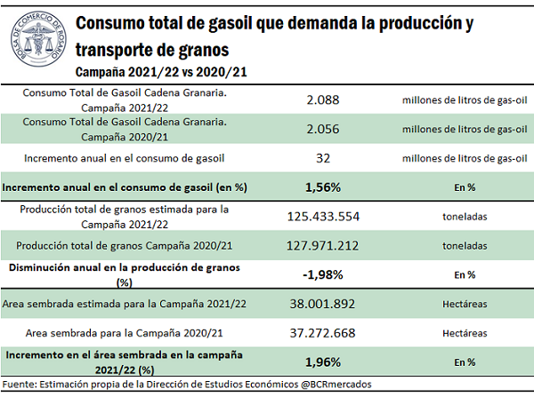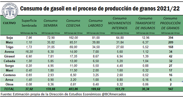 Para el cálculo del consumo de gasoil, se toman todas las estimaciones de superficie sembrada (SS) y producción de la Guía Estratégica para el Agro (GEA) de la Bolsa de Comercio de Rosario. Además de los principales cultivos, como soja, maíz, trigo, girasol y cebada, se consideran otros cultivos que se extienden sobre la Argentina, como sorgo, arroz, centeno, maní, lino, entre otros.