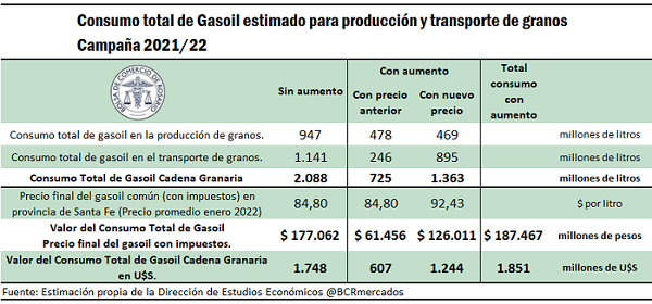 De esta manera, considerando el consumo estimado de gasoil de 2.088 millones de litros, las cadenas productoras de granos esperan gastar $ 10.405 millones adicionales por este aumento de precios. Valuado en dólares, representa cerca de US$ 103 millones adicionales que las cadenas agroindustriales tendrán que desembolsar por este aumento.