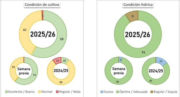 Según los últimos relevamientos, el 80,2% del área en pie cuenta con una condición hídrica Adecuada a Óptima, mientras que el 100% de los lotes se mantiene entre Normal y Excelente, un dato que refuerza las buenas perspectivas en las zonas que avanzan hacia etapas decisivas. Actualmente, el 38,1% del área total transita desde botón floral en adelante, ingresando en fases críticas de definición del rendimiento.
