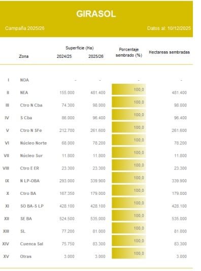 Girasol 2025/26: la cosecha se frena por lluvias pero el 100% del cultivo mantiene buen estado