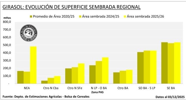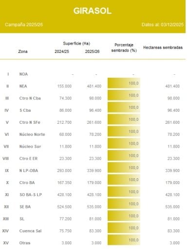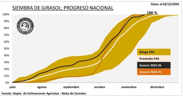 La Bolsa de Cereales confirmó que quedó finalizada la siembra de las 2,7 millones de hectáreas destinadas al girasol en el ciclo 2025/26. Aunque aún restan algunos lotes por sembrar en sectores del centro y sur de Buenos Aires, estas superficies no modificarían la estimación actual de área implantada.