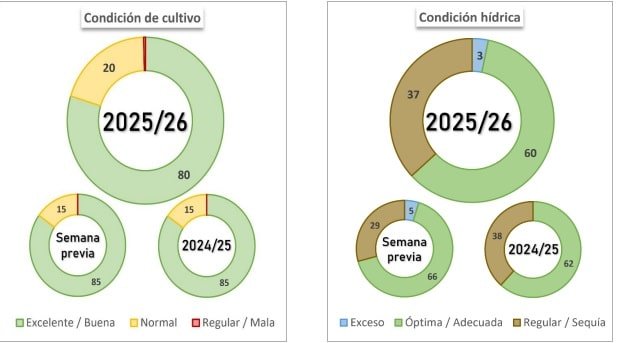 En este marco, el comportamiento de las precipitaciones en el corto y mediano plazo será determinante. Nuevos aportes hídricos permitirían sostener el estado del cultivo, especialmente en los cuadros que ingresan en las fases donde se define el rendimiento. Por ahora, y pese a las señales de alerta, el girasol conserva una condición Normal/Excelente en el 100% del área relevada, consolidando un escenario productivo que sigue siendo favorable, aunque cada vez más dependiente del clima.