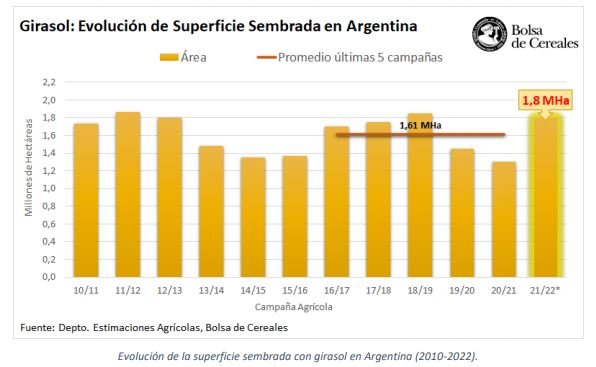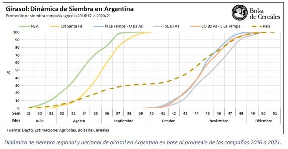 En la primera semana de junio se dio inicio al relevamiento de precampaña de girasol para el ciclo 2021/22. Desde entonces y hasta la fecha, se ha ido registrando semanalmente la tendencia en la intención de siembra para el nuevo ciclo de la oleaginosa, cuya ventana óptima se extiende desde mediados del mes de agosto en las regiones del norte del país, hasta fines de noviembre en el sur del área agrícola.