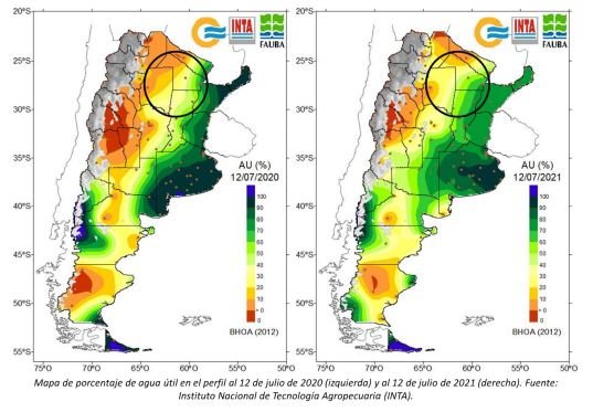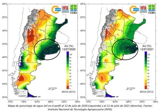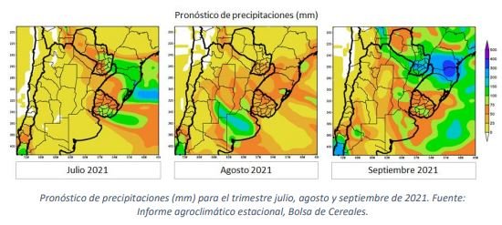 Por otro lado, para el trimestre de la primavera 2021 se espera una reactivación de las lluvias sobre toda el área agrícola, fundamentalmente sobre el noreste y sur, que proveerían la humedad necesaria para el crecimiento y desarrollo de los cuadros tempranos del norte del país y para la siembra del girasol en Buenos Aires y La Pampa.