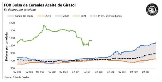 El precio FOB del aceite de girasol en puertos argentinos muestra la situación descripta anteriormente. Luego de la tendencia alcista iniciada en junio del 2020, se consolidó una baja que llevó las cotizaciones a los mínimos de 2021. Sin embargo, aún superan a los máximos registros de los últimos 3 años para esta altura del año. Por su elevada correlación, el precio del girasol recibido por el productor en el mercado doméstico (Cámara Bahía Blanca) muestra un comportamiento similar, pero con una caída más pronunciada desde los 460 usd/tn de fines de marzo del 2021. No obstante, los 345 usd/tn registrados en la primera mitad de julio aún se ubican un 38% por encima de los valores del año pasado.