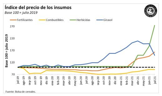 Con respecto a los precios de los principales insumos, se observa un alza para la campaña 2021/22. Los herbicidas y fertilizantes son los que registran los mayores incrementos, inicialmente como consecuencia del aumento de los precios del petróleo y los granos. La reciente baja del precio de los granos todavía no se plasma en el precio de los insumos, por el sostenimiento de la demanda para abastecer la siembra gruesa.
