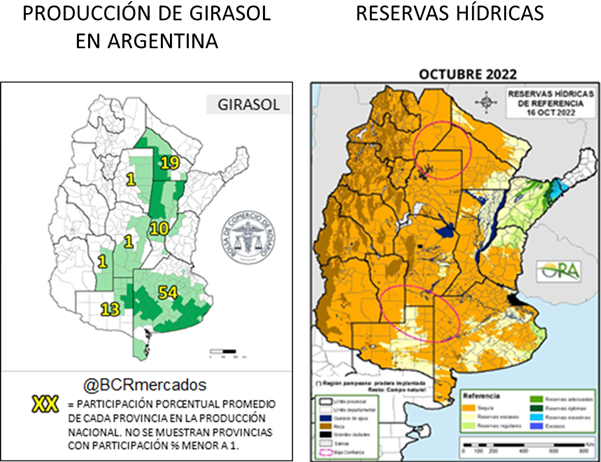 La producción de girasol en Argentina tiene dos grandes núcleos, uno con epicentro en Chaco y norte de Santa Fe, y otro en el sur de la provincia de Buenos Aires. En base a los mapas de la Oficina de Riesgo Agropecuario (ORA), se observa que las reservas hídricas en las regiones donde se cultiva el girasol han disminuido notoriamente respecto al año 2021, lo cual repercute en la producción de la próxima cosecha. En la última semana, particularmente, el panorama se agravó en el sur de la provincia de Buenos Aires, el núcleo productivo que hasta ahora venía relativamente indemne.