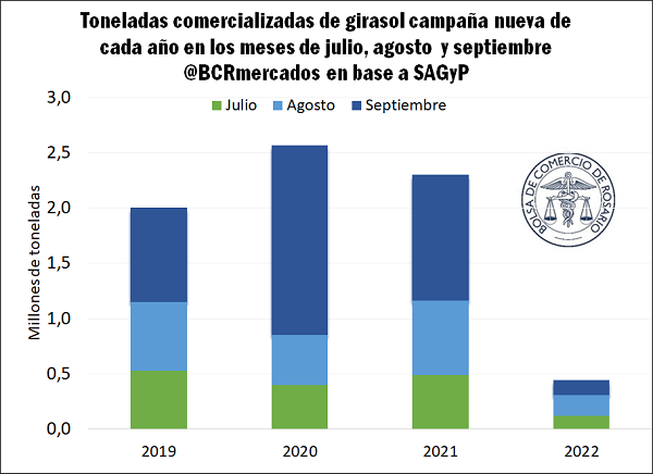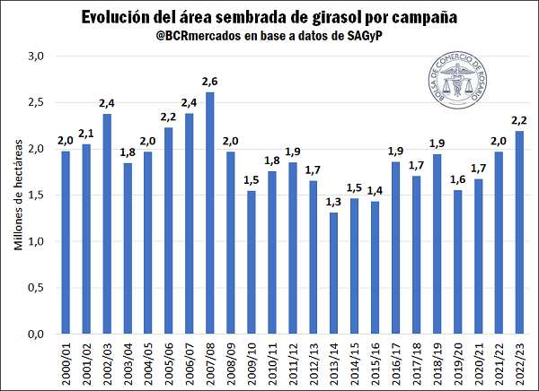 Frente a este panorama, si bien se proyecta un incremento de la superficie dedicada al girasol, la falta de humedad demora la siembra especialmente en el núcleo sur. Debe destacarse, de todos modos, que las 2,2 M ha que se han proyectado para la cosecha 2022/23 suponen la mayor superficie destinada a la oleaginosa desde la campaña 2007/08.