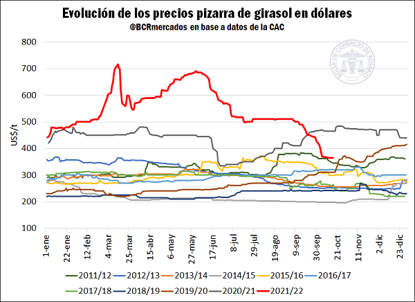 Desde los últimos máximos alcanzados a comienzos de junio el precio de la cotización local del girasol ha descendido casi de manera constante. En dicho momento se encontró en US$ 690/t, mientras que en la última semana tuvimos valores de US$ 365/t, según los precios pizarra de la Cámara Arbitral de Cereales (CAC – BCR). De esta forma, puede afirmarse que en este período nos encontramos con una caída cercana al 47% en términos relativos. Asimismo, los valores actuales se encuentran por debajo de los precios registrados un año atrás, puesto que para el 18 de octubre de 2021 se publicó una cotización de US$ 465,3/t para la oleaginosa, implicando una disminución interanual del 21,5%.