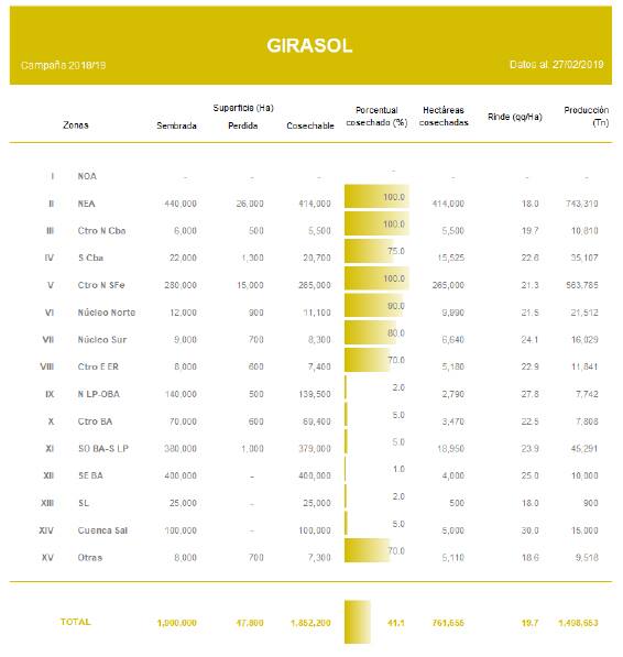 Lentamente comenzó la cosecha en los núcleos productivos del sur de la región agrícola, llevando el avance nacional al 41,1 % del área apta y permitiendo acumular un volumen parcial próximo al millón ymedio de toneladas. A medida que la recolección cobre fluidez en la región bonaerense, el rinde promedio país se irá incrementando durante las