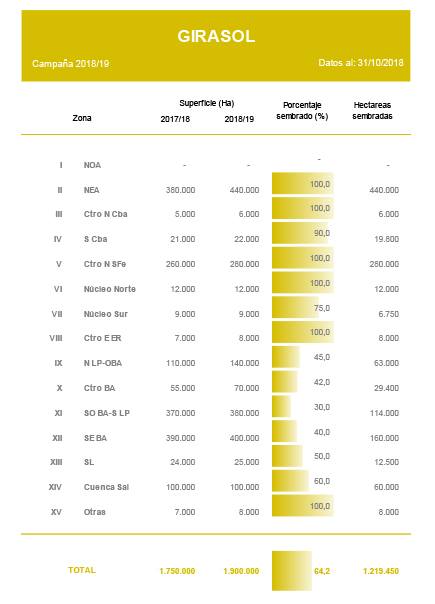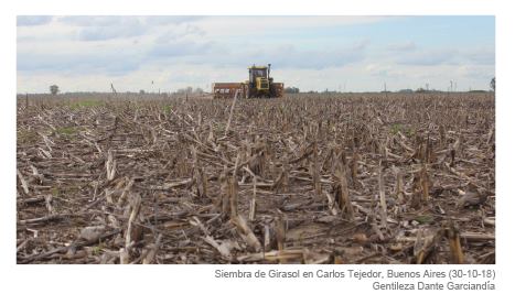 A pesar de las precipitaciones acumuladas sobre gran parte del área agrícola nacional, la siembra de girasol avanzó 8,2 puntos porcentuales durante la última semana. A la fecha, el 64,2 % de las 1.900.000 hectáreas proyectadas para la campaña 2018/19 ya se encuentran implantadas, manteniendo un adelanto interanual de 4,2 puntos porcentuales. En números absolutos, se incorporaron más de 1,2 millones de hectáreas con la oleaginosa y gran parte de la superficie mantiene una condición de cultivo entre buena y excelente.