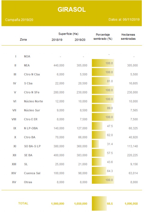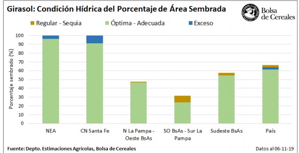 La siembra registró un progreso intersemanal de 15,5 puntos porcentuales y cubre el 66,5 % de las 1,65 MHa proyectadas para este ciclo. En los núcleos girasoleros del sur del área agrícola, ubicados en las provincias de Buenos Aires y La Pampa, los progresos intersemanales fueron de entre 18 y 28 puntos porcentuales. No obstante, se mantiene una demora interanual de -10,5 puntos debido a la imposibilidad de sembrar en las zonas que aún no disponen de una adecuada humedad superficial. Los cuadros implantados en el centro y norte del área agrícola han recuperado condición luego de las últimas lluvias registradas.