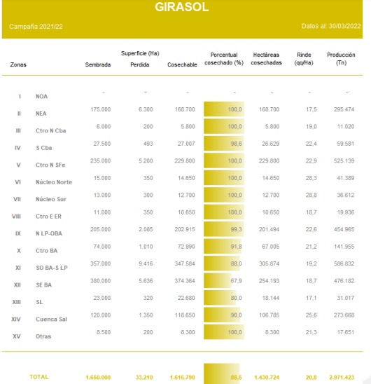Con respecto al área aún en pie, su mayor parte se encuentra distribuida a lo largo del Sudeste de Buenos Aires, donde la recolección solo cubrió un 67,9 % del área apta, entregando un rinde medio de 18,7 qq/Ha. En paralelo, el Sudoeste de Buenos Aires y Sur de Córdoba también concentra una significativa superficie a la espera de ser recolectada
