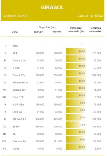 Luego de una semana con precipitaciones de variada intensidad en el sur del área agrícola nacional, la incorporación de cuadros de girasol comenzó a tomar ritmo. A la fecha el avance de siembra se ubica en el 86,6 % de las 2.000.000 Ha proyectadas para la campaña 2022/23. Aún se mantiene una demora interanual en las labores, pero hoy en día apenas es de 2,5 p.p. Los mayores progresos fueron relevados en las zonas Sudeste de Buenos Aires y Sudoeste de Buenos Aires-Sur de La Pampa. En cuanto a la condición hídrica de los cuadros ya implantados, el 83,7 % del área registra una condición entre adecuada y óptima