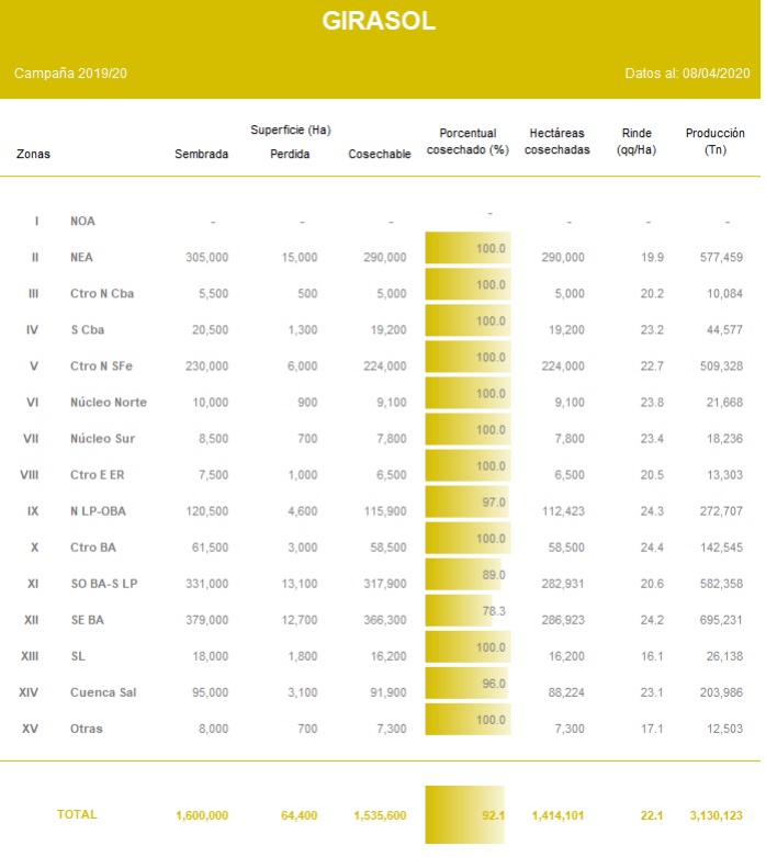 En las regiones Sudeste de Buenos Aires y el Sudoeste de Buenos Aires-Sur de La Pampa, los progresos intersemanales fueron de 19,2 y 16 puntos porcentuales respectivamente. Por su parte, el Centro de Buenos Aires y San Luis finalizaron la recolección, cerrando el ciclo con rindes de 24,4 y 16,1 qq/Ha respectivamente. Hasta el momento el volumen de producción alcanzado supera 3,1 MTn, bajo este escenario se consolida nuestra proyección de producción al cierre de campaña en 3,4 MTn. La presente proyección se ubica un 12,8 % por debajo al ciclo previo (Producción 2018/19: 3,9 MTn), dicha caída se explica por una reducción del área sembrada registrada durante la actual campaña.