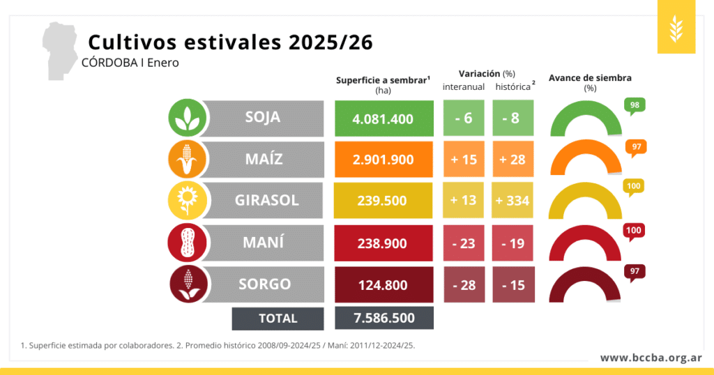 La campaña estival en Córdoba ingresó en una nueva fase con la siembra completamente concluida y los cultivos ya implantados en todo el territorio provincial. El relevamiento más reciente confirma un arranque favorable en términos generales, aunque con fuertes contrastes regionales marcados por la disponibilidad de agua y las altas temperaturas.