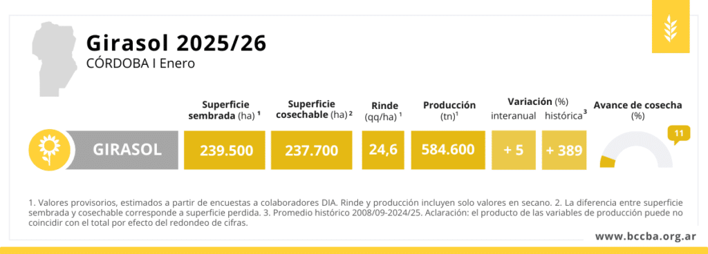 Uno de los datos más destacados es el desempeño del girasol, que vuelve a ganar protagonismo en la rotación agrícola. La primera estimación de producción anticipa un volumen muy por encima del promedio histórico provincial, impulsado principalmente por un notable incremento en la superficie sembrada. Según las proyecciones, el total producido podría superar en más de un 300% el histórico de Córdoba.