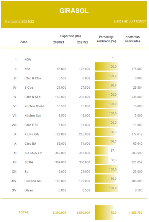 Tras un progreso intersemanal de 11,9 puntos porcentuales, ya se encuentra implantado el 78 % de las 1,65 MHa proyectadas para el ciclo 2021/22. Se mantiene un adelanto interanual de 1,7 p.p