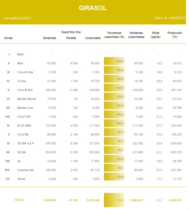 Por otro lado, también se logró finalizar con la recolección en el Norte de La Pampa-Oeste de Buenos Aires, con un rinde promedio récord de 27,5 qq/Ha, superior al promedio de las últimas 5 campañas en un 14,6 %. El volumen de producción aportado por esta región de más de 323.000 toneladas, se ubica como el más alto del quinquenio.