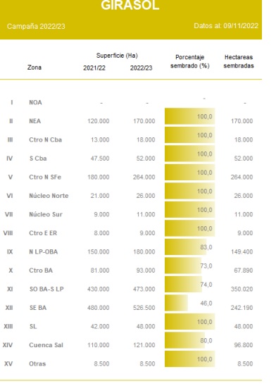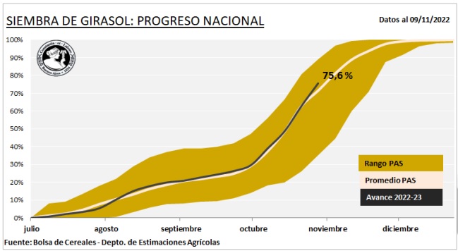 La incorporación de cuadros de girasol se concentró durante la última semana en el sur del área agrícola nacional. A la fecha el avance de siembra se ubica en el 75,6 % de las 2 MHa proyectadas para la campaña 2022/23, 300.000 Ha más que las incorporadas el ciclo previo. A pesar de registrar una demora interanual en las labores de 10,9 p.p., la misma viene disminuyendo semana a semana. Gran parte de los planteos sembrados desde nuestro informe previo, se ubican en las provincias de Buenos Aires y La Pampa. En cuanto a la condición del cultivo, el 85,7 % del área implantada mantiene una condición entre buena y normal.