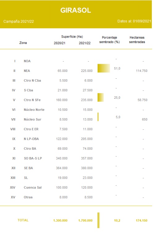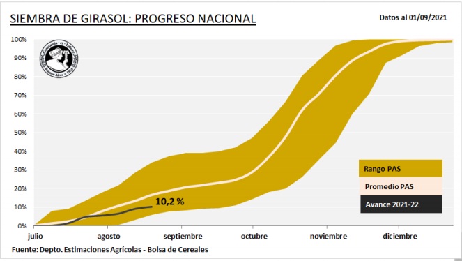 Desde nuestro informe previo, el progreso de siembra de girasol fue de 1,1 puntos porcentuales. La siembra cubre el 10,2 % del área, proyectada actualmente en 1,7 MHa. En comparación al ciclo previo, el cual también estuvo afectado por déficit hídrico, se registra un adelanto de 0,3 pp. Sin embargo, sobre el centro y norte del área agrícola, la falta de humedad en el estrato superficial continúa limitando el progreso de las labores, manteniendo una demora respecto al promedio histórico de -6,3 puntos porcentuales.