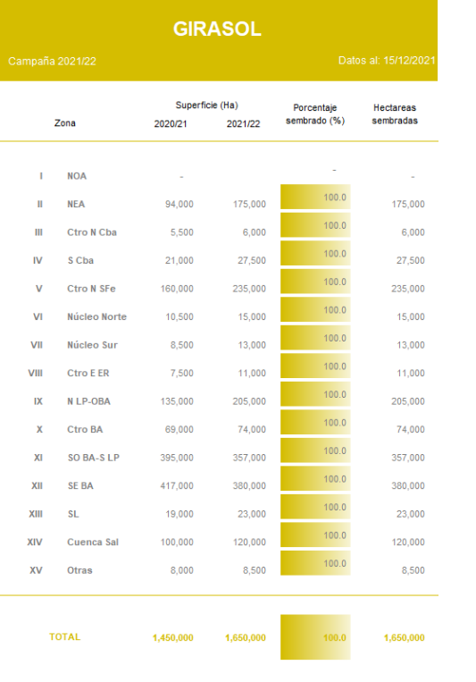 En el centro del área agrícola, si bien aún no se cuenta con valores de rendimientos esperados, el 100 % del área presenta condición de cultivo Normal a Excelente. Si bien se registraron focos de granizo que provocaron daños en tejidos, se dieron en focos aislados y en general, en zonas relativamente marginales para la producción de la oleaginosa.