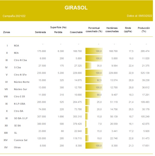El 38,7 % del área apta se encuentra cosechada, tras un progreso intersemanal de 8,4 p.p. Se releva una demora interanual de -4,6 p.p. El rinde promedio se ubica en 20,7 qq/Ha. Se mantiene la proyección en 3,3 MTn.