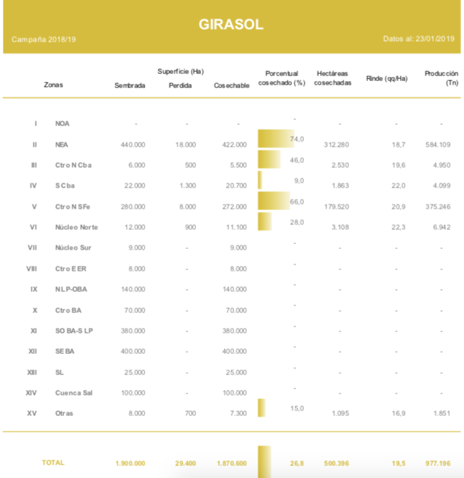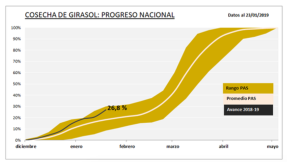 Sin embargo, los núcleos girasoleros del sur bonaerense aportan un 42 % del área sembrada a nivel nacional y el buen clima ha acompañado el crecimiento y desarrollo del cultivo desde su siembra. Casi la totalidad del área implantada en estas regiones mantiene una condición de cultivo entre normal y excelente y los cuadros más adelantados ya transitan etapas de llenado de grano.
