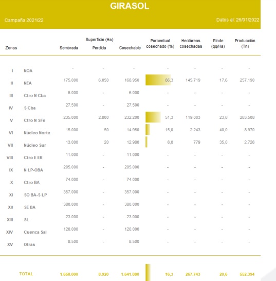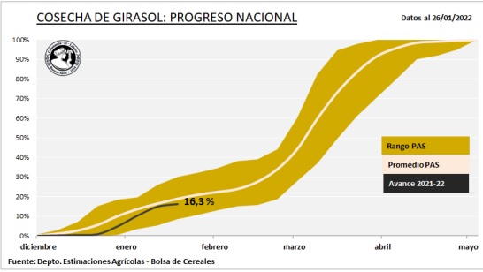 Con un progreso intersemanal de 1,3 p.p., se alcanzó a cosechar el 16,3 % del área apta. El rinde promedio se ubica en 20,6 p.p., manteniendo la proyección de producción en 3,5 MTn.