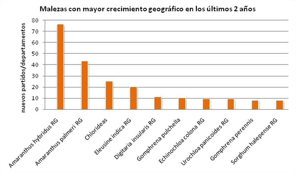 El Pasto amargo (Digitaria insularis) resistente a glifosato es quien le siguió en crecimiento, con unos 10 nuevos departamentos y se ubicó mayormente en las zonas NEA y NOA. En este mismo nivel de crecimiento geográfico se ubicaron las Gomphrenas, (G. pulchella y G. perennis), amarantáceas muy tolerantes a glifosato, el Capín (Echinochloa colona) resistente a glifosato, la Brachiaria o Pasto crespo (Urochloa panicoides) resistente a glifosato y el Sorgo de Alepo (Sorghum halepense) también resistente a este activo, para completar la lista de las 10 malezas que más crecieron este período de 2 años.