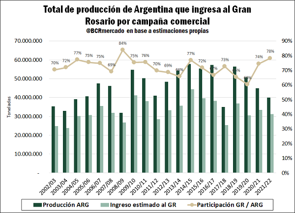 El principal medio de transporte empleado en el comercio de granos local es el de camión: se espera que se reciban 900.000 camiones de soja para su descarga en la zona del Gran Rosario, lo que totalizarían unas 27 millones de toneladas en ingreso de mercadería solo a través de este medio.