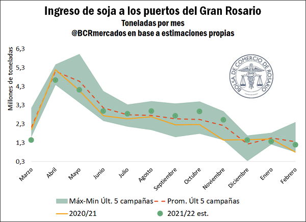 En este marco, se espera que el Gran Rosario reciba 31,2 millones de toneladas de soja a lo largo de la campaña comercial 2021/22, solo considerando el grano de origen nacional. Aunque esto resulta en una caída de unos 2,2 millones de toneladas con relación a lo que ingresó en la campaña que acaba de finalizar, producto de la menor producción a nivel país, la participación del Gran Rosario en el flujo de mercadería nacional crecería entre campañas, alcanzando un total cercano al 78% de la producción de soja de Argentina en la 2021/22.