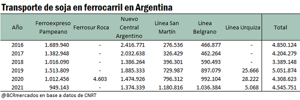 El transporte por ferrocarril viene ganando participación de forma continua en los últimos años en el Gran Rosario. Si bien el volumen de soja total transportado a través de las líneas férreas nacionales se mantuvo mayormente estable en los últimos años, se vio un destacable incremento en las cargas de las Líneas Belgrano y San Martín, que abastecen al Gran Rosario de la mercadería del centro y norte del país. Estas líneas vieron incrementar sus volúmenes transportados en los últimos seis años a una tasa del 122% y 327%, respectivamente. Destacan las obras realizadas en los últimos años para la conexión del Belgrano Cargas con los puertos de Timbúes, en donde se ubican las plantas de mayor capacidad de procesamiento del país.