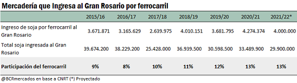 Así, la participación del transporte ferroviario en las cargas de soja que ingresan al Gran Rosario pasó de representar un estimado de 9% en la campaña 2015/16, a representar el 13% en la 2020/21, en la que se estima arribó al área a través de este medio de unas 4,2 Mt de la oleaginosa. Nuestra estimación es que el ingreso de mercadería al Gran Rosario a través del ferrocarril puede alcanzar 4 millones de toneladas en la campaña 2021/22, por lo que se mantendría una participación del 13% del total ingresado a la zona.