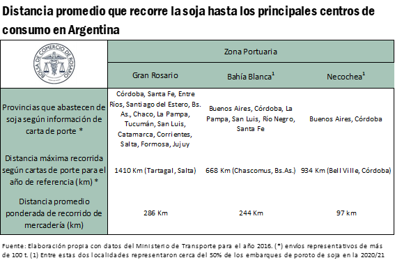 Entre las provincias de Córdoba, Santa Fe y Buenos Aires, se satisface el 85% del total de la soja que capta el Gran Rosario para crushear o para exportar como poroto (en menor medida). En promedio, el poroto de soja que llega a las terminales y plantas del Gran Rosario recorre una distancia de 286 kilómetros desde el lugar donde es producido. Esto es mayor en promedio a la distancia que recorre el poroto que se exporta desde la región de Bahía Blanca (244 km) y Necochea (97 km), localidades portuarias estas dos últimas que representaron el 50% de las exportaciones de poroto de soja de nuestro país en la campaña 2020/21. La distancia más larga recorrida hasta el Gran Rosario que se registró en este trabajo tuvo origen en Tartagal, Salta, a unos 1.410 kilómetros de distancia.