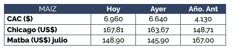 En el día de hoy el precio del maíz con entrega hasta el 15/6 se ubicó en el valor de $ 7000 /t, sin embargo, no se descartan negocios por valores más elevados. Con respecto al segmento forward, para la posición de julio el valor abierto ofrecido fue de US$ 148/ t, incrementándose en US$ 3/t con respecto a la jornada anterior. Con respecto a agosto el valor ofrecido fue el mismo. Para la posición de septiembre el precio fue de US$ 150/t