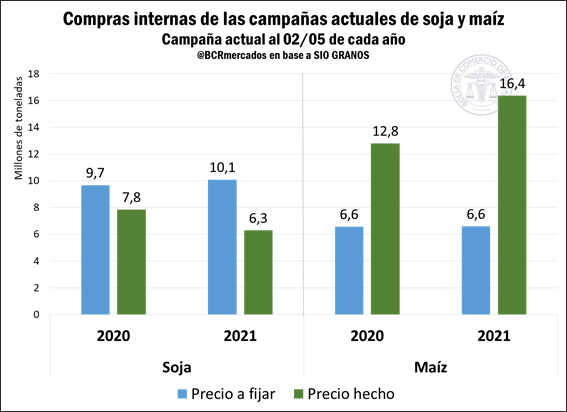En lo que respecta al maíz, también se observa un repunte en las compras de industriales y exportadores. A principios de abril, estos negocios acumulan 22,9 Mt, cuando en año anterior se registraron 19,3 Mt, en tanto que la proporción de compras con precio hecho pasó del 66,1% en 2020 al 71,3% en 2021.